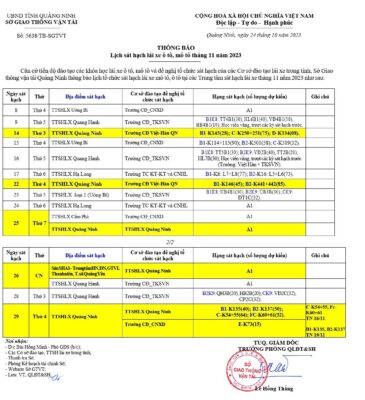 Ngày 24/10/2023 Sở Giao thông vận tải Quảng Ninh ban hành Thông báo số 5638/TB-SGTVT về Lịch sát hạch lái xe ôtô, môtô tháng 11 năm 2023. Chi tiết như sau:
